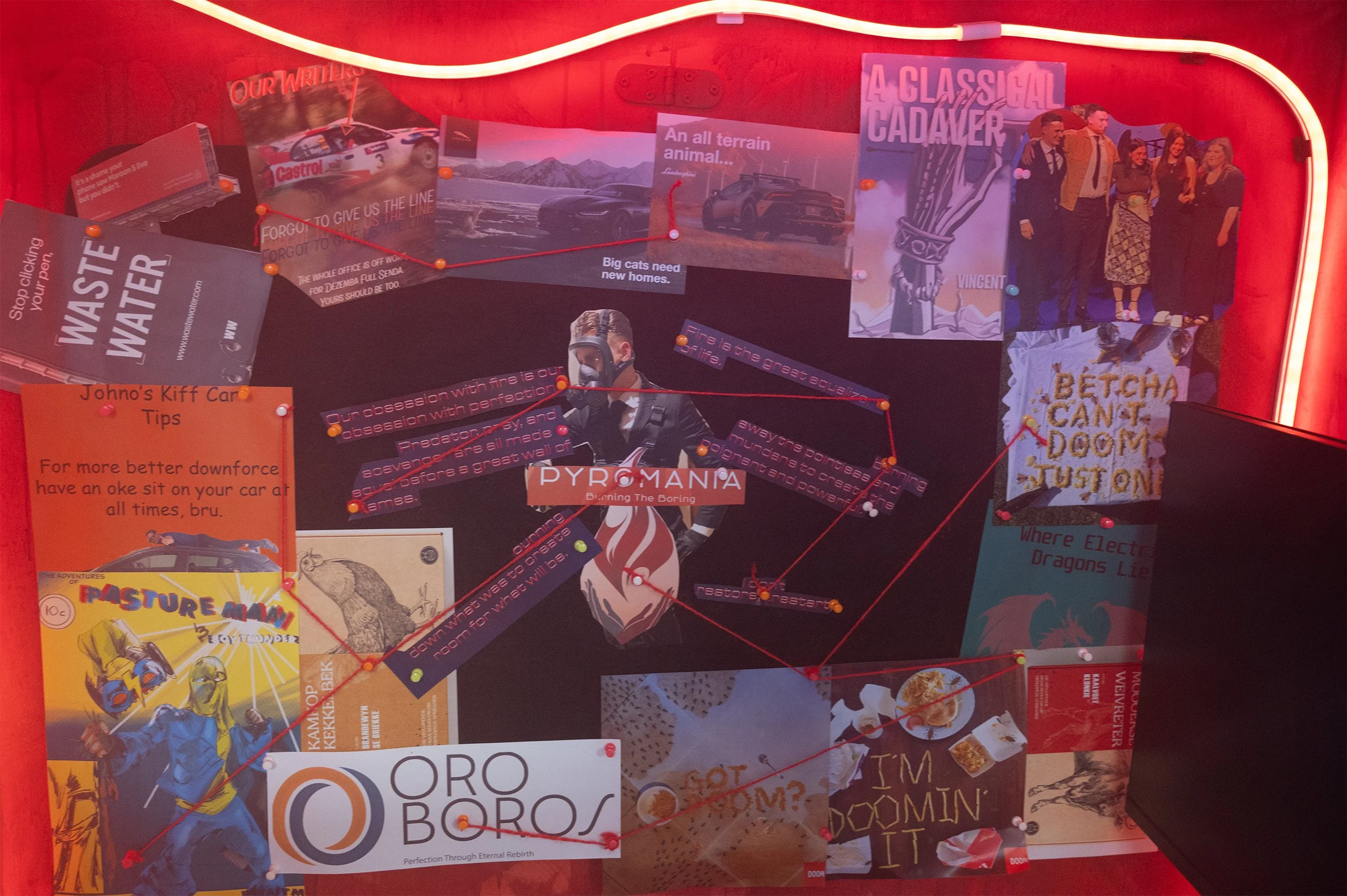 The Pyromania installation, a project that culminated from 3 months of arduous work, was an installation set up inside Vega School Bordeaux during the annual showcase of student work. For this, I wanted to create a unique experience for anyone who spoke with me. Anyone can make a good design or write a good line, but knowing who did it and why they did it will bring to light true talent.